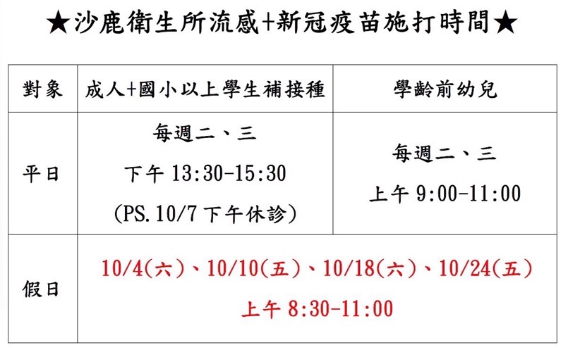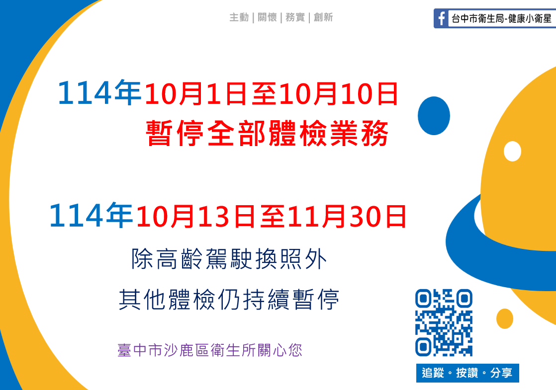 沙鹿區衛生所 114年10月癌症篩檢活動 臺中市沙鹿區衛生所 2025-09-19 日 期 星 期 時 間 配合醫院 114.10.3 五 16:00-19:00 汝安診所 114.10.8 三 17:30-20:00 童綜合醫院 114.10.17 五 17:30-20:00 光田綜合醫院 114.10.29 三 17:30-20:00 童綜合醫院 ★篩檢項目: ※...