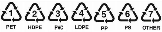 - 塑膠材質的標誌主要由三個箭頭形成之三角形,順時針三角形號碼的形狀,由三個循環的箭頭組成,以表示資源利用的循環不息。中間的數字代表該塑膠之材質,1至7的阿拉伯數字,顯示不同的塑膠材質。