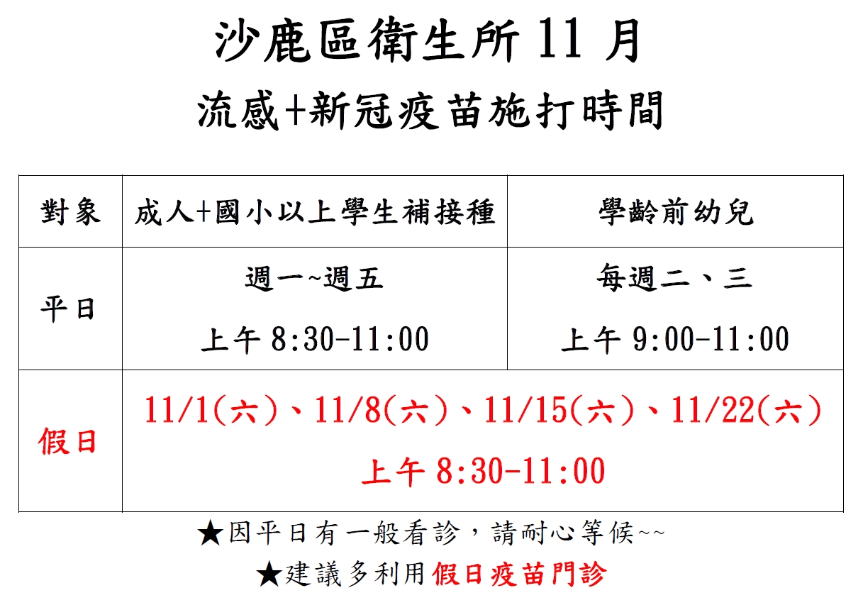 > 沙鹿區衛生所流感+新冠疫苗施打時間