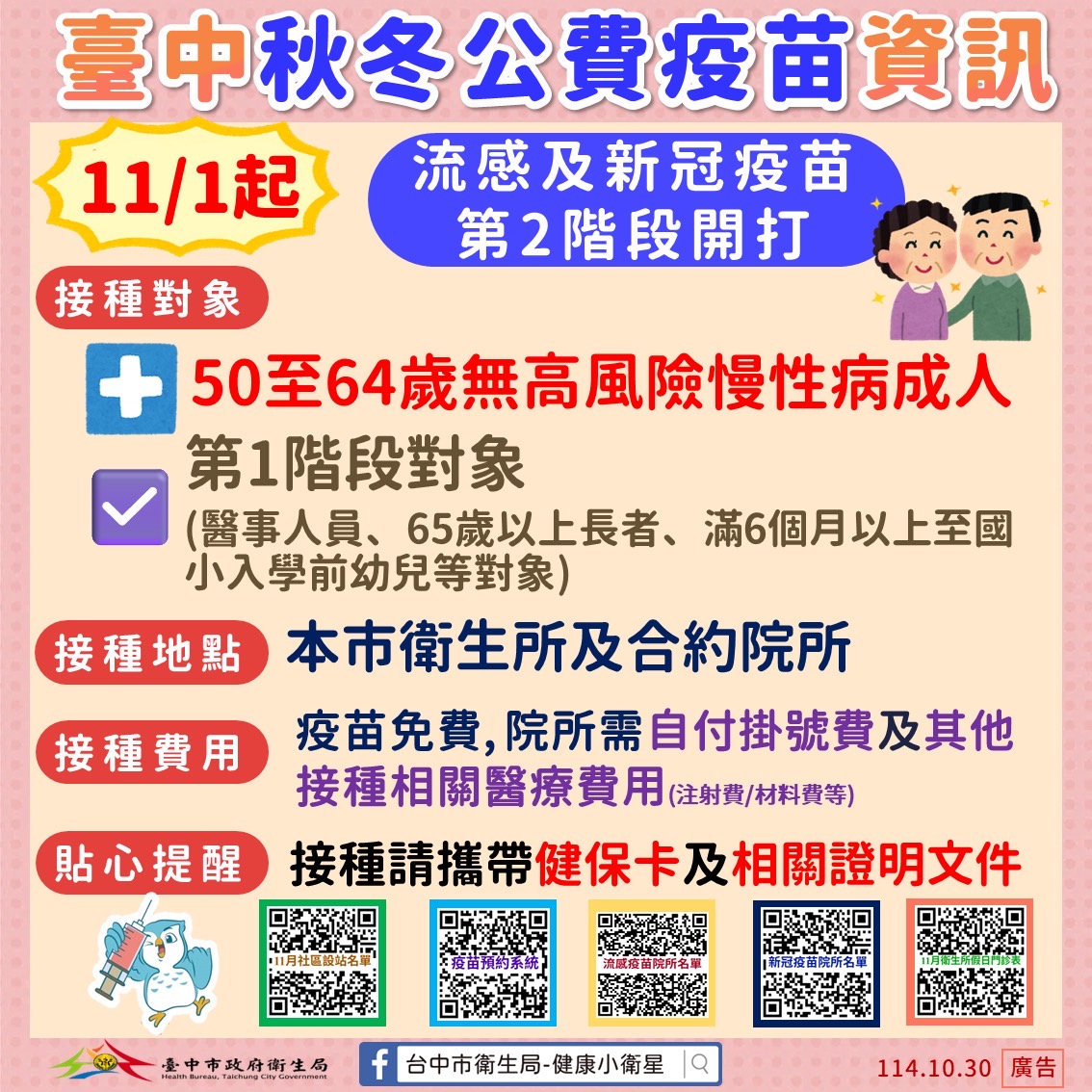 114年11月1日起,開放50歲以上民眾施打流感疫苗,歡迎符合資格民眾前來接種~