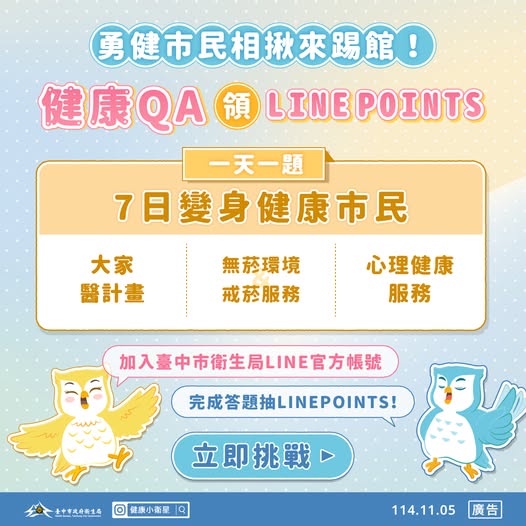 加入臺中市政府衛生局官方LINE帳號,完成答題抽LINE POINTS 5點 💰